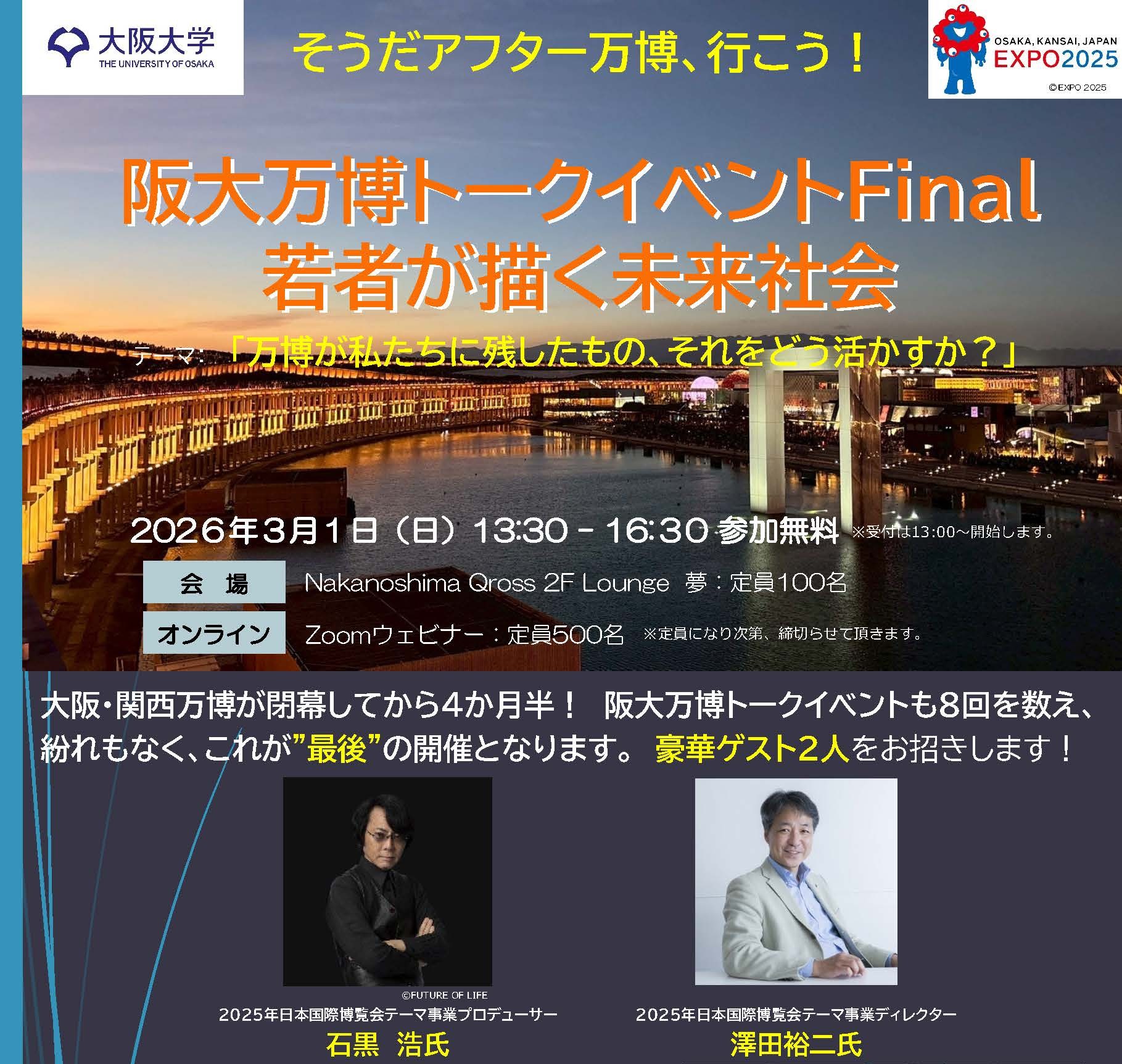 【3月1日(日)開催!】阪大万博トークイベントFinal 若者が描く未来社会「万博が私たちに残したもの、それをどう活かすか?」