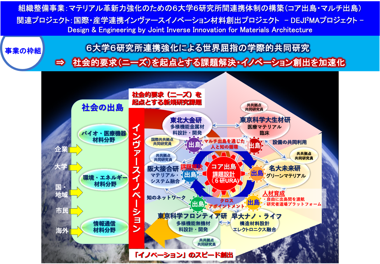 大阪大学接合科学研究所、東北大学金属材料研究所、東京科学大学(旧:東京工業大学)フロンティア材料研究所での材料接合、金属、無機材料における世界屈指の学術基盤と、名古屋大学未来材料・システム研究所、東京科学大学(旧:東京医科歯科大学)生体材料工学研究所、早稲田大学ナノ・ライフ創新研究機構での環境・エネルギー、生体・医療材料、エレクトロニクスにおける世界屈指の研究開発基盤を融合することにより、学際融合・異分野融合研究を展開する。本組織整備事業では、研究所間連携の戦略的司令塔として主幹校(接合科学研究所)に「コア出島」を設置し、各研究所には連携研究の実施主体「出島(マルチ出島)」を設置して、『コア出島・マルチ出島方式』の異分野融合の研究所間連携体制を構築する。このようにして発展・強化した研究所間連携体制のもと、6研究所の専門性の垣根を越えた人と知の循環により、社会的要求を起点とする課題解決ならびにイノベーション創出の加速化、さらには迅速な社会実装を通じて、マテリアル革新力の強化を図ると共に、我が国が世界を先導する新材料技術の創成を目指して、関連プロジェクト「国際・産学連携インヴァースイノベーション材料創出プロジェクト」を推進する。