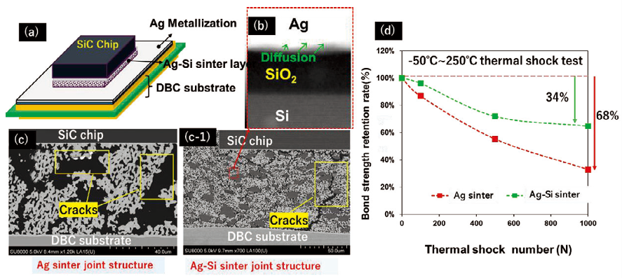 高温動作の課題に対しては銀系ナノ粒子(粒径<100 nm)焼結接合技術の活用が主に検討されているが、それも厳しい熱衝撃試験(-50~250℃)では、銀接合層と半導体デバイス接合界面(境界)に、亀裂の発生および構造破壊の問題があった。