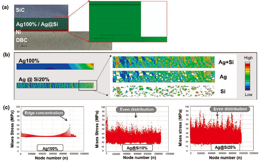 このような微細構造の改善により、Ag@Si20% 接合部は、純 Ag 接合部の2倍のせん断強度保持率を示すなど、機械的信頼性が大幅に向上した(Figure 1)。Finite-element model(FEM)でのシミュレーション結果は、Si 添加がモジュール内で熱応力を均一化または低減するように積極的に調整していることを示した(Figure 2)。これらの要因が相まって、熱サイクル応力に対する材料の耐性を高めることに寄与している。