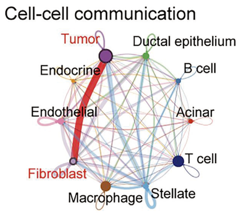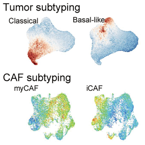 また、腫瘍微小環境(TME)は血管、免疫細胞、線維芽細胞など多様な細胞群で構成されており、腫瘍の不均一性や悪性 度 に 大 き く 影 響 を 与 え ま す。最 近 の シ ン グ ル セ ル 転 写 解 析(scRNAseq)は、TME の理解を深め、細胞状態や相互作用に関する重要な知見をえることができました。これにより、新たな腫瘍サブタイプや細胞間の相互作用が特定され、PDAC の生物学に関するより精密な研究が進展しています。これまでに、130,000以上の細胞を含むscRNAseq データセットを用いて PDAC を細胞レベルで分析し、さらに TCGA の RNAseq データを再解析することで、腫瘍と癌関連線維芽細胞(CAF)の間のコミュニケーションを明らかにしました。公開されているリファレンス単細胞トランスクリプトームのデータセットは、異なる研究グループにより報告されていますが、臨床環境やサンプリング方法、使用する scRNAseq プラットフォームの違いにより、一貫性 に 欠 け て い ま す。