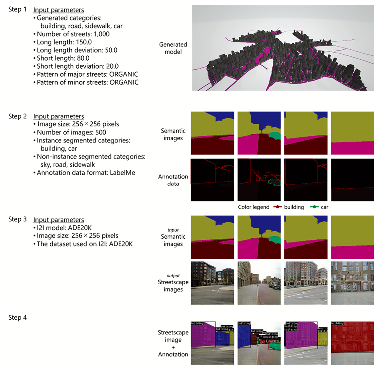 もう少し具体的に説明します。Step 1では3D 都市モデルを自動生成するために都市の特徴を定めるパラメータを入力します。Step 2では Step 1で生成した3D 都市モデルと画像サイズなどの設定を入力し、ゲームエンジン上でアノテーションデータと Step 3で景観画像データを生成するために必要なセグメンテーション画像のペアを生成します。Step 3では画像変換技術を用いて Step 2で生成したセグメンテーション画像を現実らしい景観画像に変換します。そして、Step 4でアノテーションデータと景観画像を関連付けます。