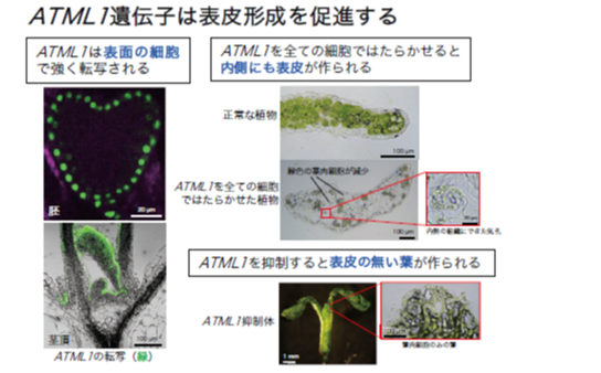私たちはこれまでに、シロイヌナズナのATML1遺伝子が表皮を形成する能力を持つことを明らかにしています。ATML1遺伝子は器官表面の細胞で強く転写(活性化)されており、ATML1が全ての細胞で転写されるように改変した植物では、内側の組織にも表皮細胞が作られました。一方、ATML1を不活化した植物では表皮の無い葉が作られました。