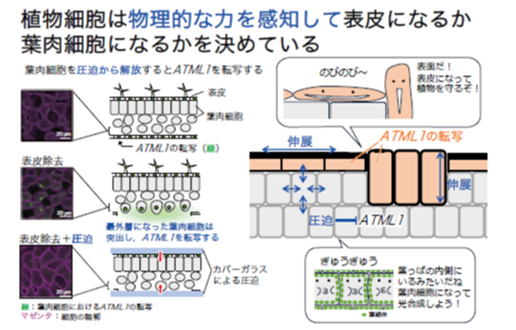 これらの結果から、植物細胞は物理的な力を感知することで自身の位置を認識し、表皮に分化するか葉肉細胞に分化するかを決めていると考えられます。