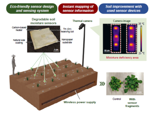 本研究では単純な構造のセンサと無線給電、そしてサーマルカメラを組み合わせることで、センサ自体の分解性と必須機能を両立した新しいコンセプトのセンシングシステムを実証することに成功しました。これにより、環境に優しい、持続可能なセンサ技術の発展や、「センシングできる肥料」などの新技術の開拓が期待されます。