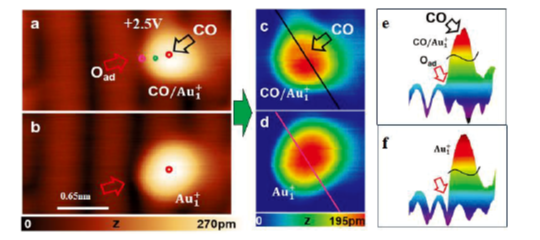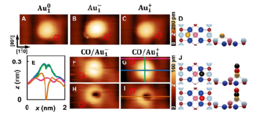 1)原子間力顕微鏡 / ケルビンプローブ力顕微鏡を用いて、酸化ルチル TiO2表面上の Au1に正負両方の帯電をさせると、CO の吸着が著しく促進されることが出来た(図1)。一方、中性の Au1(Au10) では CO の吸着は観察されなかった。2)CO吸着について、Au1への2つの異なるCO吸着形状が同定された(図2)。 吸着した Au1の酸化還元状態、CO 吸着形状、および AFM 探針によるCO 吸着 / 脱着を完全に制御できた。3)帯電した Au1(Au1- と Au1+)上で、CO と隣接する酸素原子との間の Eley-Rideal 酸化 反応が、AFM 探針によって活性化されることが分かった。4)原子間力顕微鏡/ ケルビンプローブ力顕微鏡法を用いて金属酸化物表面上の貴金属にバイアス電圧を加えることにより電荷状態を操作することができした(図1)。電荷状態の操作により帯電した貴金属原子が一酸化炭素の吸着の鍵となり、かつ電場を加えることにより触媒反応にできた(図3)。