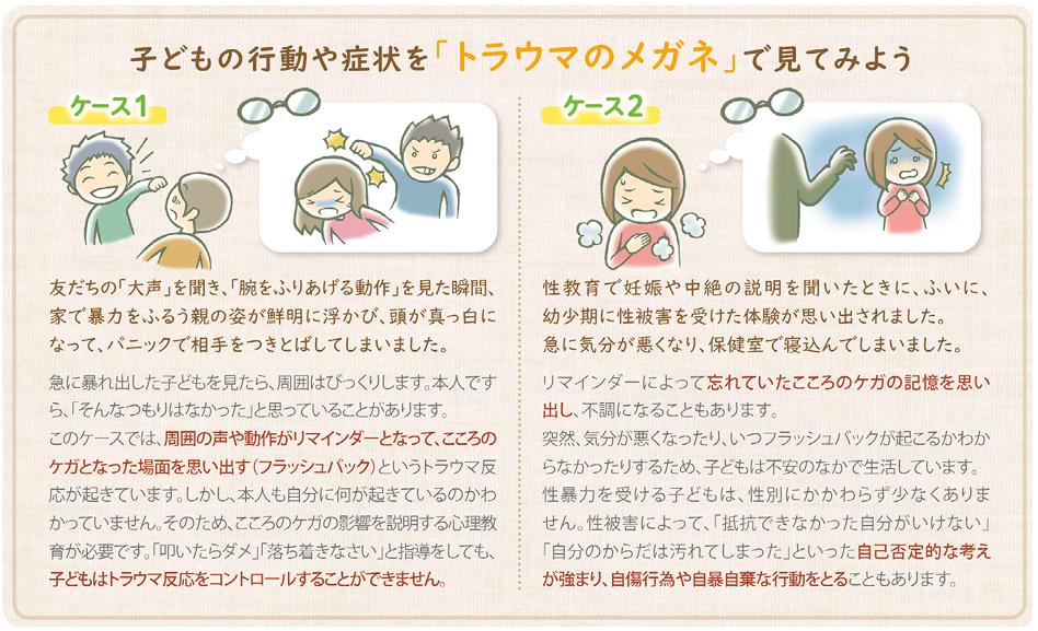 そのような状態を〈問題行動〉とみなし、𠮟責や排除で対応すると、子どもの状態は一層悪化する。この悪循環を断ち、トラウマの影響を理解して関わることをトラウマインフォームドケア(Trauma Informed Care: TIC)という。