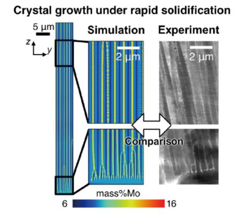 Ni 基超合金の粉末床溶融結合型金属3D 積層造形において、材料中の元素分布の偏りは力学特性に大きく影響し、信頼性の高い材料設計において重要な問題である。本研究では、計算熱流体力学シミュレーションによる温度場解析とフェーズフィールド法による元素分布予測を錬成させて、Ni 基超合金の粉末床溶融結合における最大108 K s-1の高冷却速度での凝固中に形成される数百 nm 程度の局所的な元素の分布の偏りを予測することに成功した。さらには、予測された元素分布が割れやすさに与える影響を評価することで、割れの発生を抑制するための新たな合金設計指針を提案した。
