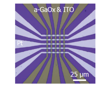 また、このヒステリシス特性は600 K(327 ℃)の高温下でも確認され、メモリ機能は長時間に渡り保持されていた。本結果から、a-GaOx メモリスタが優れた高温耐性を備えていることが明らかになった。さらに、高度3次元集積化を目指して電子線リソグラフィ等の微細加工技術を駆使し、a-GaOx クロスバーアレイメモリスタを構築した(図2)。10,000秒以上の不揮発性保持、多段階コンダクタンス変調、スパイクタイミング依存性可塑性等のニューロモルフィックコンピューティングに不可欠な基礎特性が観測された。以上の結果は、a-GaOx クロスバーアレイメモリスタが AI エッジデバイスの有望なハードウェアプラットフォームであることを示している。