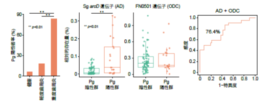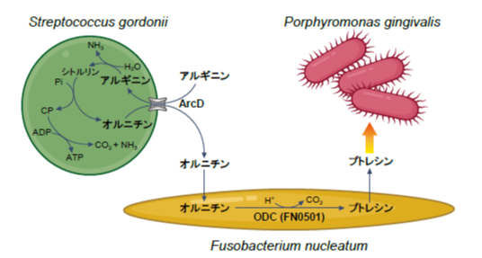 我々は過去に、初期定着菌Streptococcus gordonii がアルギニン・オルニチンアンチポーター(ArcD)を利用してオルニチンを排出し、それが cross-feeding 機構によりF. nucleatum のバイオフィルムとしての成長をサポートすることを示した。今回まず、S. gordonii との共培養時のF. nucleatum のメタボローム解析および遺伝子発現解析を行 っ た と こ ろ、F. nucleatum は オ ル ニ チ ン デ カ ル ボ キ シ ラー ゼ(FN0501)という酵素の発現を高め、S. gordonii から供与されたオルニチンをプトレシンへと代謝することがわかった。実際に、S. gordonii の ArcD 欠損株との共培養時にはF. nucleatum のプトレシン産生能は著しく低下することから、この反応はS. gordonii のアルギニン代謝とF. nucleatum のオルニチン代謝が掛け合わさることで生じるシナジー代謝であることを示した。プトレシンを含むポリアミンは、多くの細菌に対して様々な生理反応を引き起こすことが知られている。そこで代表的な歯周病菌であるPorphyromonas gingivalis に対するポリアミンの効果を評価したところ、プトレシンはP. gingivalis のバイオフィルム化を促進するだけでなく、そこからの離脱も促進することで、バイオフィルムとしての生活環を加速させることが示唆された。実際に3菌種を用いた混合バイオフィルム実験の結果、S. gordonii とF. nucleatum によるプトレシンが生じない条件(∆arcD 変異体)では、P. gingivalis のバイオフィルム化とそこからの離脱は有意に抑制された(図1)。さらに102名の歯垢サンプルを用いた解析の結果、歯周病重篤度の高い被験者においてS. gordonii とF. nucleatum のプトレシン産生遺伝子モジュールとP. gingivalis 遺伝子は高い共起関係にあることが確認された(図2)。このことからF. nucleatum を中心とした栄養ネットワークが歯周病発症に関与する可能性が示された(図3)。