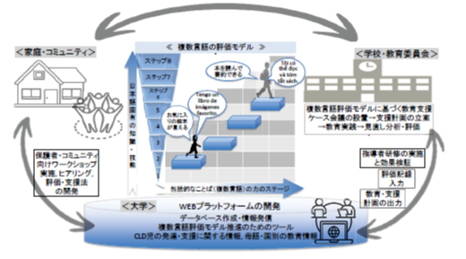 本 研 究 は、多 文 化 多 言 語 の 子 ど も(Culturally Linguistically Diverse Children; CLD 児)の言語教育と評価を対象としている。現行の学校教育システムは、CLD 児の多様な言語背景に十分対応できておらず、これが言語的・教育的な課題を生じさせている。こうした課題を解明し、CLD 児の学びを支える効果的な教育環境の構築を目指している。これまでに、CLD 児の複数言語能力の発達に関する基礎研究を行い、学校との協働を通じて複数言語の教育実践を進め、実態に基づく効果的な教育支援策を提案してきた。その成果は、文部科学省の「対話型アセスメント DLA(Dialogic Language Assessment)」(2014)の開発につながり、さらに同省の委託事業の一環として2025年に新たな複数言語の包括的評価モデルを構築した。