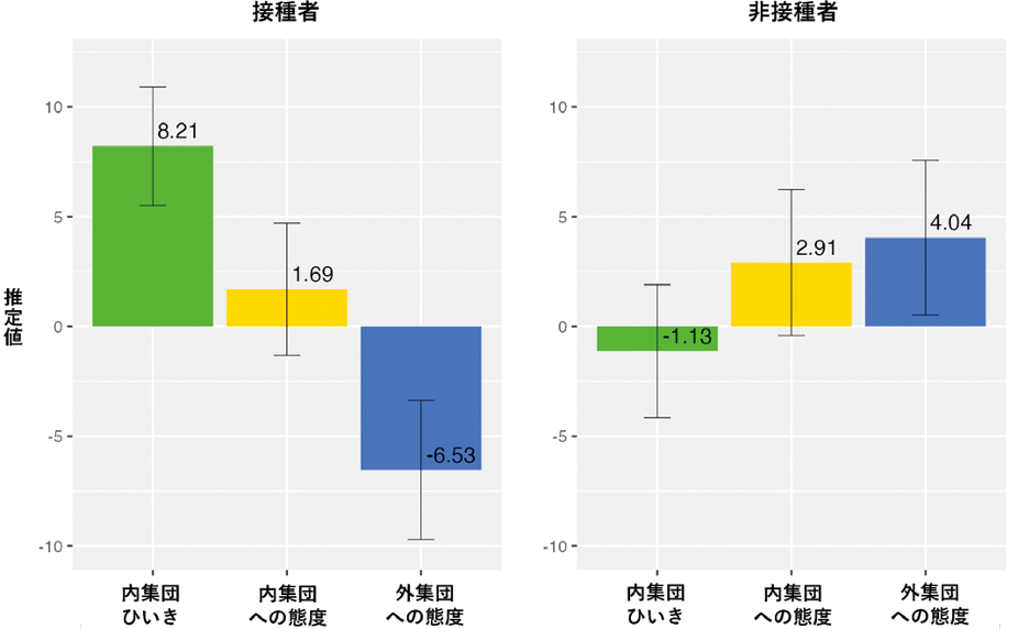 2022年1~2月には、新型コロナ・ワクチンの接種者(N=796)と非接種者(N=782)を対象にお金を配分するゲーム実験を行い、接種者と非接種者それぞれの「内集団ひいき」を測定しました。内集団ひいきとは、自分と同じ接種歴を持つペアへの配分額と自分とは異なる接種歴のペアへの配分額の差で評価されます。結果として、接種者から、非接種者ペアに比べて接種者ペアへの配分額を増やす傾向が観察されましたが、非接種者からは、自分と同じ接種歴を持つペアをひいきするような傾向は観察されませんでした。さらに分析を進めると、非接種者のうち、「できるならワクチン接種を受けたいが、健康上の理由などで受けられないから」という理由で接種を受けなかった人たちの間では、同じ接種歴の非接種者ペアでなく、接種者ペアへの配分額を増やす傾向が観察されることが分かりました。ただし、この後同様の実験を続けることで、接種者と非接種者の間の分断が時間の経過とともに深まっていくことも分かりました。