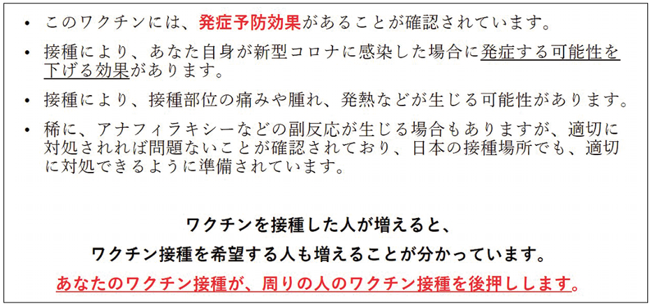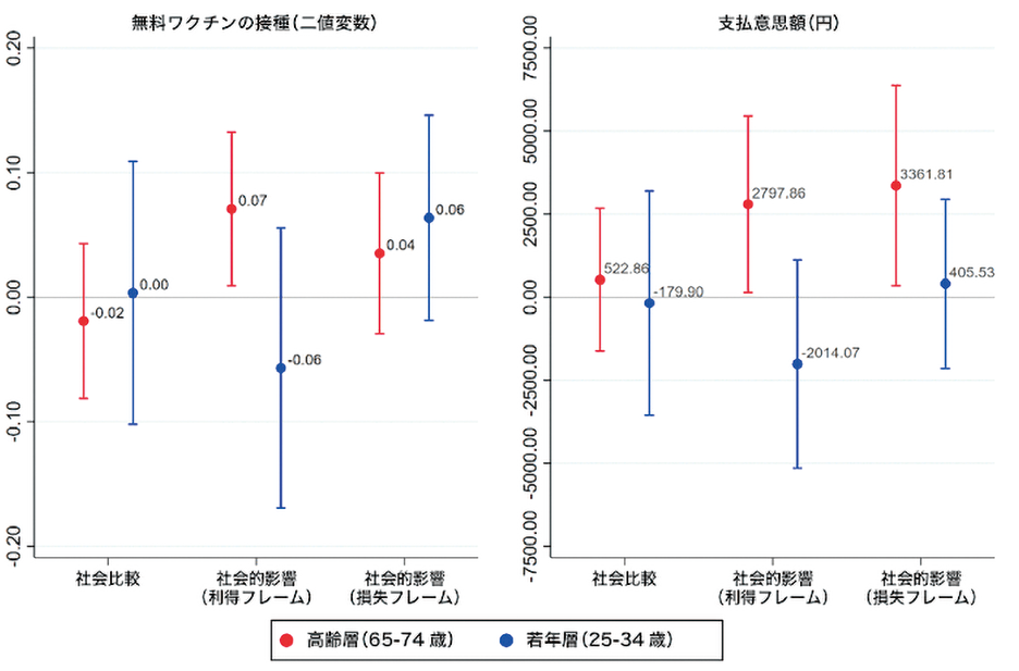 2021年3月、1,595名を対象にしたオンライン・サーベイ実験を日本で実施して、3つのナッジ・メッセージが人々の新型コロナ・ワクチンの接種意向及び自律的な意思決定や精神的負担の水準に及ぼす影響を比較検証しました。統計解析の結果から、「あなたのワクチン接種が周りの人のワクチン接種を後押しする」と伝えるナッジ・メッセージが、高齢層で接種希望者を増やす効果を持つことが分かりました。同じ内容を「あなたが接種しないと周りの人のワクチン接種が進まない」と損失表現で伝えるメッセージや、「同年代の10人中 X 人が接種すると回答している」と伝えるメッセージは、もともと接種を受けるつもりでいた高齢層の意向をさらに強化することが分かりました。但し、損失メッセージからは閲覧者の精神的負担を強める可能性も示唆されましたし、これらのメッセージは若年層の接種意向を高める効果は示しませんでした。