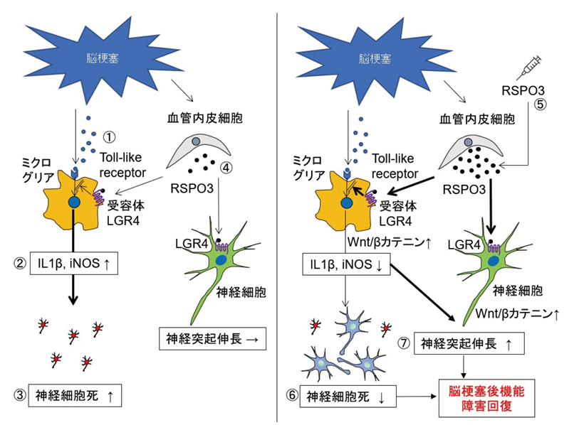 本研究では、脳梗塞マウスにおいてミクログリア・マクロファージ、神経細胞に受容体 LGR4が発現し、血管内皮細胞から RSPO3が発現することを見いだしました。RSPO3を脳梗塞1日目から脳室内に投与することにより、神経機能障害が改善し、炎症性サイトカインの発現が抑制される一方で、神経突起伸長マーカーである GAP43の発現が増加しました。RSPO3は、TLR2、TLR4、TLR9を介したミクログリアからの炎症性サイトカインの発現を抑制して神経細胞死を抑制するとともに、神経細胞においては神経突起の伸長を促進させることを発見しました。以上のことから、RSPO3/LGR4シグナルが、脳梗塞後の炎症を制御するとともに神経突起の伸長を促進させることにより、脳梗塞後の神経機能障害を改善することができる新たな分子機構であることを明らかにしました。