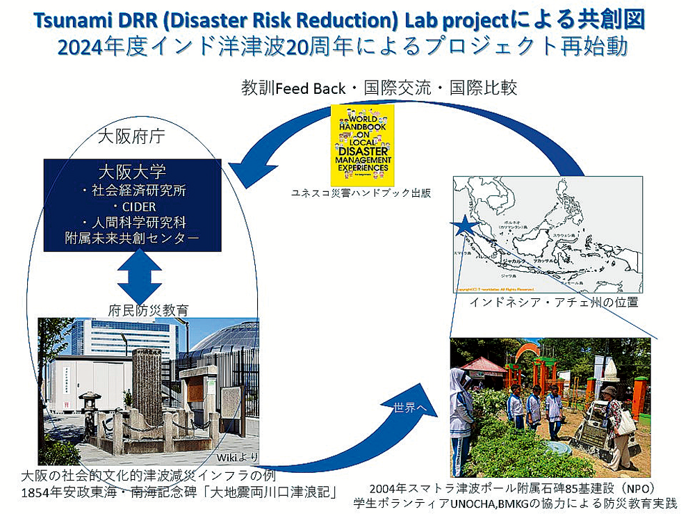 2023年度は大阪府の委託を受けて津波に対する府民の津波防災意識の調査を行いました。2024年度は調査結果を行動経済学者が防災行動に結び付けたプロジェクトに発展させたり、知見を共有して阪大の協定大学であるインドネシア気象庁(BMKG)などの政府機関や阪大の協定大学と防災教育のプロジェクトを始めたりと、地域に根付いたコミュニティ防災活動から国際連携へとさらに発展させてまいります。
