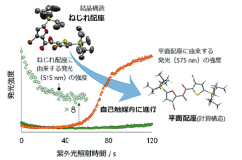 単結晶 X 線構造解析の結果、この分子は結晶中ではねじれた立体配座をとっていることがわかった。一方、以前の研究から、黄色の発光は平らな立体配座から生じることがわかっていた。今回、黄色の発光は結晶が融ける前に生じたため、分子が結晶中で立体配座を変えたことが明らかになった。さらに、この発光強度の時間変化は S 字型のカーブを描いたことから、立体配座の変化が自己触媒的に進行して結晶の規則性を乱すことで光融解に至るという融解メカニズムを解明することができた(図2)。