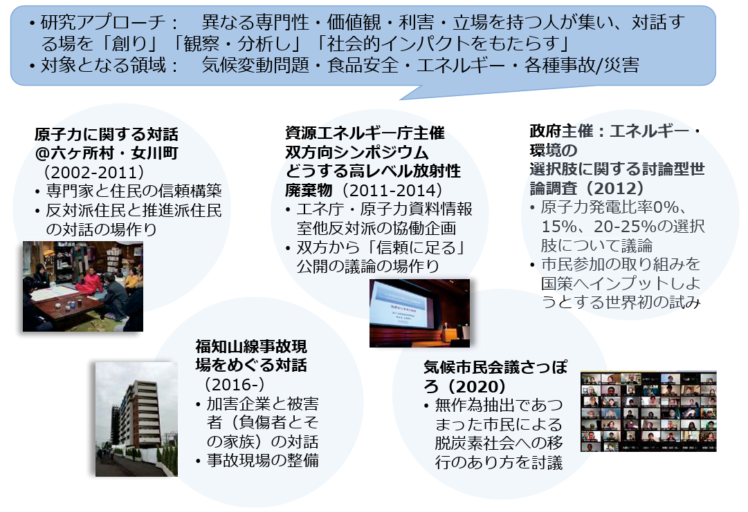 また、ミニパブリックスの手法に限定せず、異なる専門性・価値観・利害・立場を持つ人が集い、対話する場を創り、観察・分析し、社会的インパクトをもたらすことを念頭において、気候変動問題のみならず、食品安全やエネルギー問題、さまざまな事故や災害の被害からの回復プロセスの構築を対象とした実践研究を行っています(図参照)