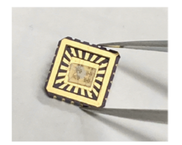 これらの課題を解決するために、高性能スピントロニクス材料(ホイスラー合金磁石)/GaN 直接接合が実現する低抵抗電極構造を用いた低消費電力・高効率スピン注入技術を開発した。しかし、体心立方構造のホイスラー合金磁石とウルツ鉱型結晶構造の GaN は、結晶構造が大きく異なり、表面の原子配列も整合していないため(図1左)、GaN上にホイスラー合金磁石を高品質に作製する(エピタキシャル成長する)ことは極めて困難であった。本研究では、ホイスラー合金磁石と GaNの接合界面に六方最密充填結晶構造のコバルト(Co)を数原子層(約0.4 nm)挿入することで、GaN 上にホイスラー合金磁石をエピタキシャル成長し、ショットキートンネル直接接合を実現することに成功した(図1右)。また、独自に開発した微細加工プロセスを用いて、ショットキートンネル直接接合電極構造を用いたテストデバイス構造を作製し(図2、図3左)、室温でスピン注入信号を観測することに成功した(図3右)。