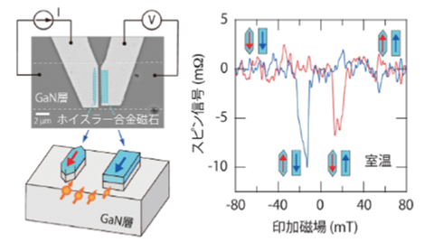 窒化ガリウム(GaN)は、青色発光ダイオードなどの発光デバイスや、パワーデバイスなどの電子デバイスの半導体材料としての研究開発が盛んに進められていますが、電子のスピン自由度を積極的に活用するスピントロニクス分野においても期待され始めている。特に、室温でのスピン緩和時間が長いと考えられていることから、室温で動作するスピン発光デバイス用の半導体材料として魅力的な材料とされており、半導体技術とスピントロニクス技術の融合を目指した研究が国内外で盛んに進められている。2017年に電流注入方式の GaN 系スピンレーザーの室温実証が報告されているが、絶縁体トンネルバリア層を用いた高抵抗のスピン注入電極構造を用いているため、レーザー発振のために大電圧を印加する必要があるという課題があった。また、スピン注入源として用いた磁石のスピントロニクス材料としての性能が低いため、半導体へのスピン偏極状態の生成効率も低いという課題があった。