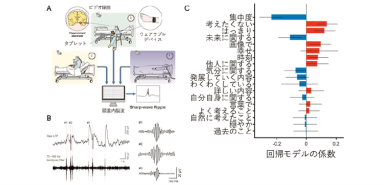 A)頭蓋内脳波計測中の患者からタブレットでの思考調査にて思考内容を評価した。また、ウエアラブルデバイスにより身体活動状態を同時計測し保存した。B) 海馬より計測した頭蓋内脳波からSWRを検知した。SWRは高周波数のリップルと鋭波(sharp-wave)からなる特徴的な波形である。C) 17項目のアンケートに対する答えからSWRの頻度を推定する一般化線形混合効果モデルの重みを比較した。