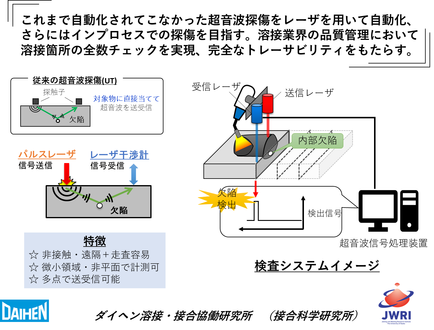 金属表面にパルスレーザを照射することで、金属内部で超音波が生じる。この超音波を利用して、溶接中に生じる内部欠陥をリアルタイムで検知する技術の研究開発に取り組んでいる。溶接はその作業工程そのものによって内部に欠陥を有する可能性があり、作業後に検査を必要とすることから特殊工程と呼ばれる。切断、掘削などを伴わず内部の欠陥を検知する、いわゆる非破壊検査技術として超音波探傷技術が用いられている。一般的な超音波探傷では、探触子という超音波を送受信する部品を検査部分近傍に押し当てる必要があるが、レーザ超音波探傷では非接触で超音波を送受信する。非接触であるためロボットに搭載し、これまで自動化されてこなかった超音波探傷を自動化することが可能となる。加えて、高温となる溶接中の溶接部近傍を直接探傷することができる。本研究では、一台のロボットに溶接用トーチとレーザ超音波探傷装置を持たせ、溶接と検査を同時に一つのシステムで完結させることを目標としている。さらには、内部欠陥だけでなく接合強度に寄与する溶け込み深さのモニタリング技術としての応用にも取り組む。